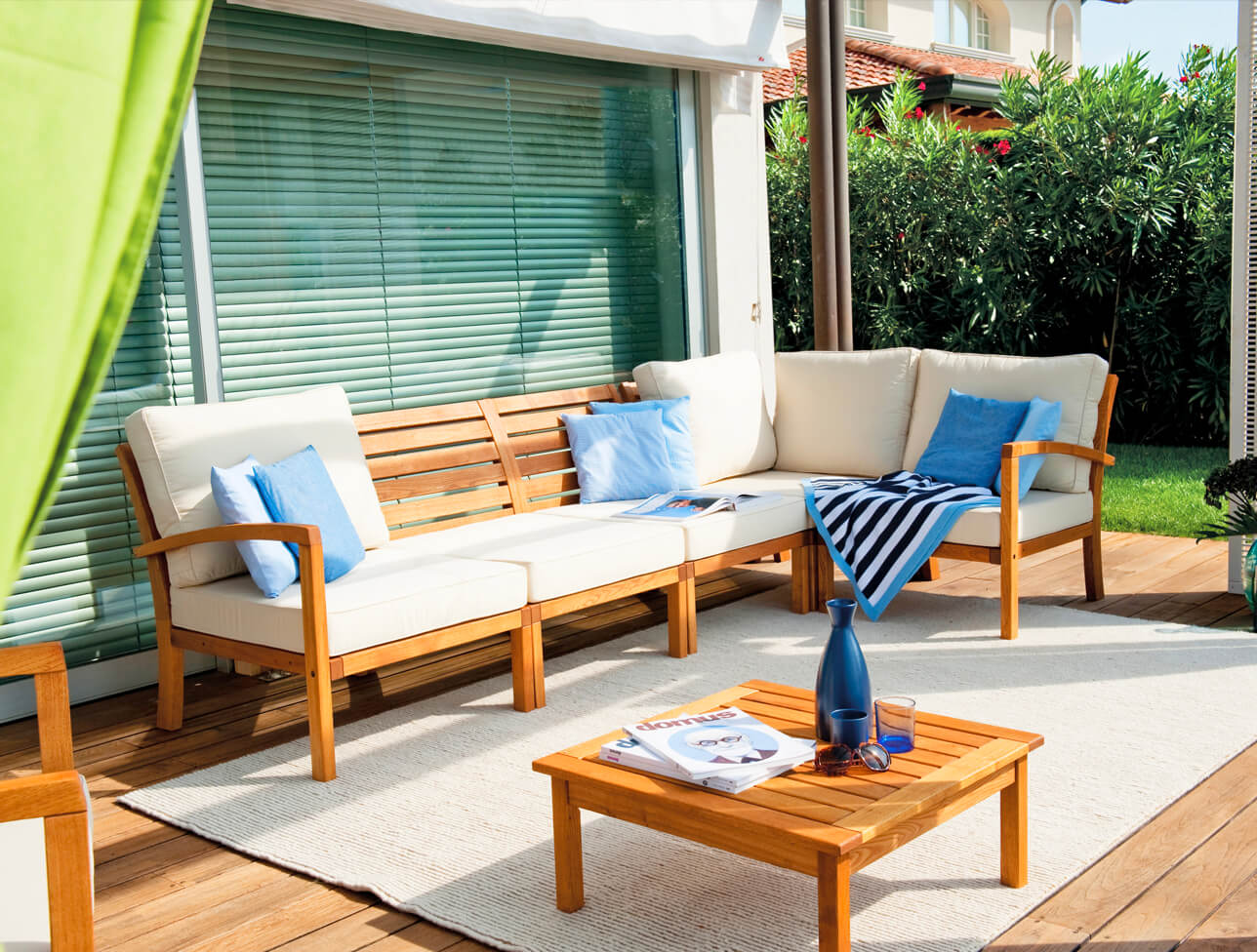 Drewno robinii akacjowej olejowane dedykowanym naturalnym olejem; pierwsza klasa odporności na warunki atmosferyczne. Występuje tylko w tkaninach Sunbrella. Pianka idealna do poduszek zewnętrznych. Duże, otwarte pory pozwalają przenikać wodzie.